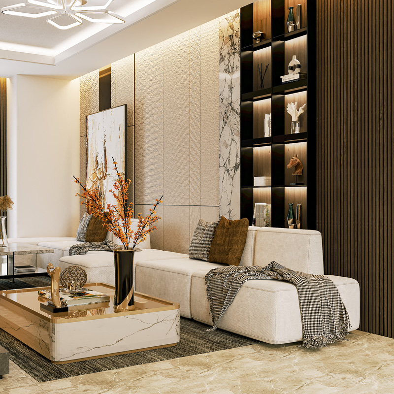Interior detailing, false ceiling, tile layout, lighting, carpentry, etc.